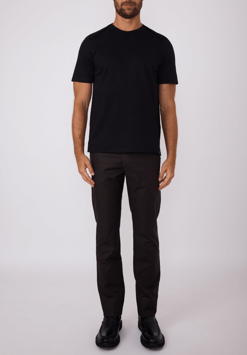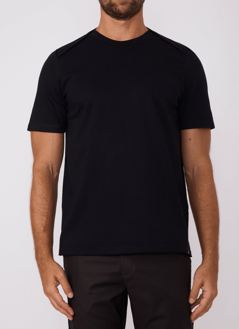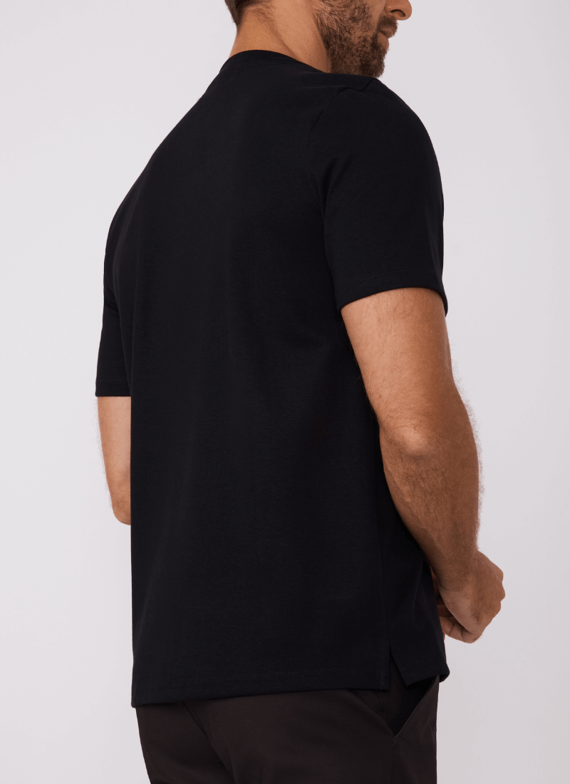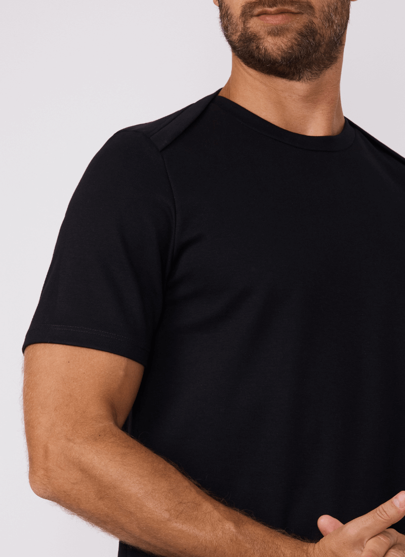 A Camiseta Masculina Ombro Transpassado Shift Preta eleva o essencial a um novo patamar, unindo design minimalista, caimento impecável e um detalhe exclusivo que transforma qualquer look: o recorte transpassado nos ombros. Um toque arquitetônico que reforça a estética contemporânea da New Old e adiciona personalidade sem excessos.