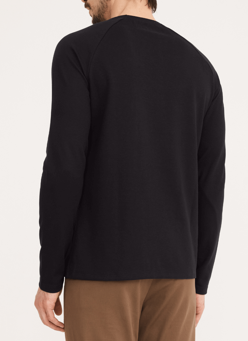 A Camiseta Masculina Raglan ML Core representa o equilíbrio entre estilo urbano moderno e conforto refinado. Com modelagem raglan que promove amplitude nos ombros e caimento ergonômico — visível por meio do corte diferenciado da manga — ela valoriza a silhueta masculina com discrição. Confeccionada em malha premium de toque macio, esta peça eleva o básico a uma referência de elegância casual.