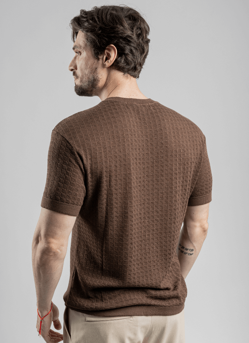 A Camiseta Masculina Tricot Groove eleva o conceito de básico com textura e sofisticação. Inspirada no visual retrô dos anos 70 — tendência forte nas passarelas e no streetwear de luxo — a peça aposta em uma padronagem geométrica que adiciona profundidade e elegância ao look, sem abrir mão do conforto.