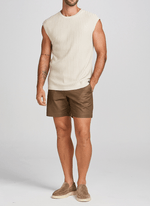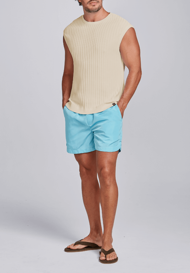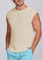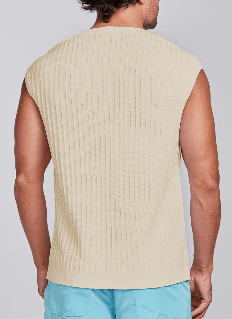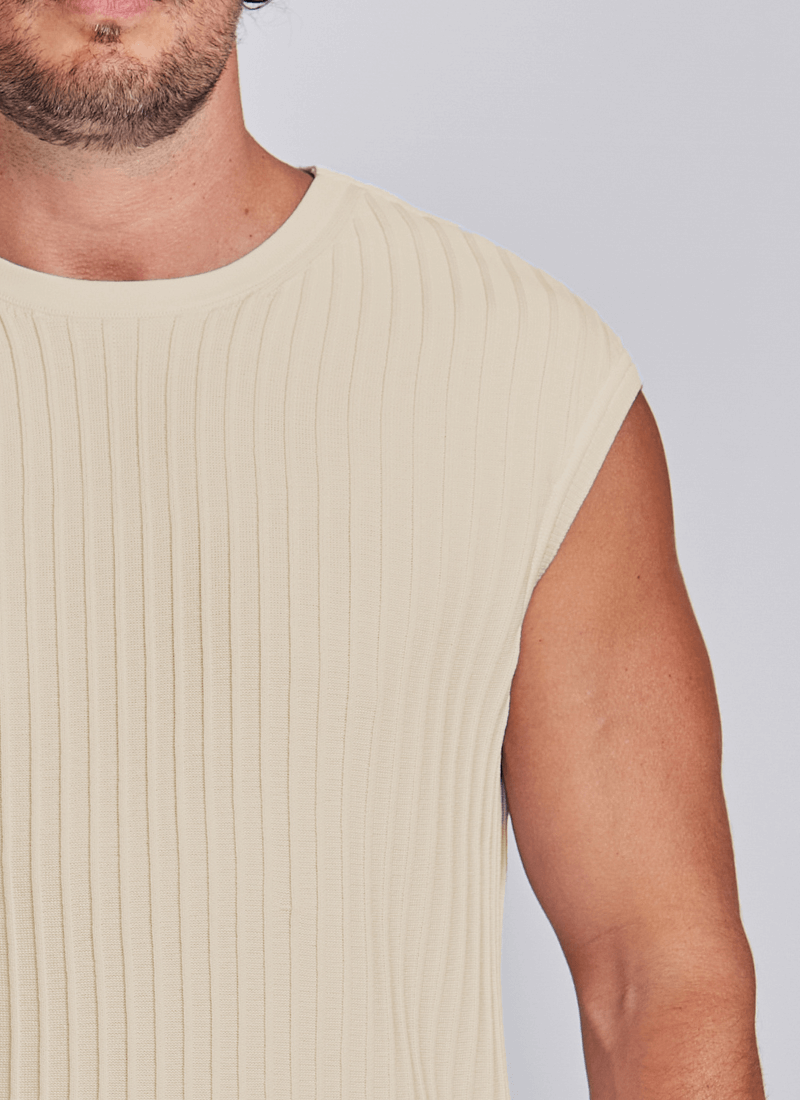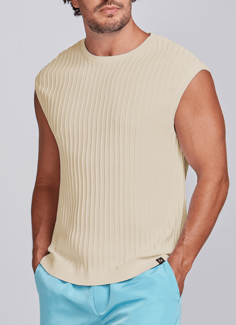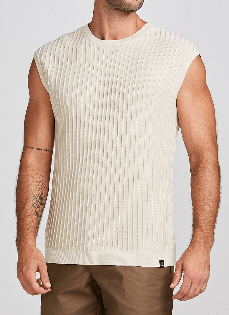 A regata masculina em tricot surge como resposta ao novo verão masculino: mais intencional, mais elegante e menos óbvio. Com estrutura canelada vertical, a peça alonga a silhueta e cria um visual limpo, atual e extremamente sofisticado, mesmo em propostas minimalistas.